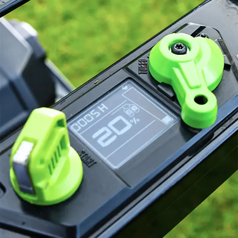 An LCD display screen is integrated into the control panel, providing a user-friendly interface for your lawnmower. This high-resolution screen offers clear information, allowing users to monitor travel speed and real-time battery power status. It also features an hour meter that summarizes total working time, helping manage maintenance schedules and optimize usage.