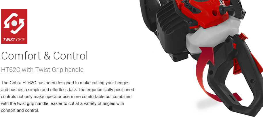 The Cobra HT62C has been designed to make cutting your hedges and bushes a simple and effortless task.The ergonomically positioned controls not only make operator use more comfortable but combined with the twist grip handle, easier to cut at a variety of angles with comfort and control.