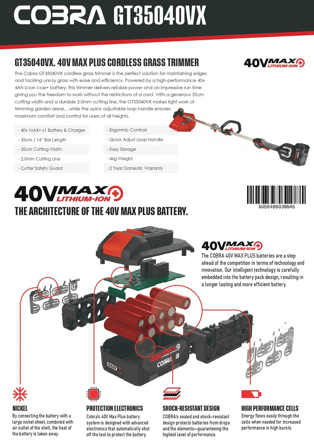 The Cobra GT35040VX cordless grass trimmer is the perfect solution for maintaining edges and tackling unruly grass with ease and efficiency. Powered by a high-performance 40v 4Ah Li-ion Max+ battery, this trimmer delivers reliable power and an impressive run time-giving you the freedom to work without the restrictions of a cord.
