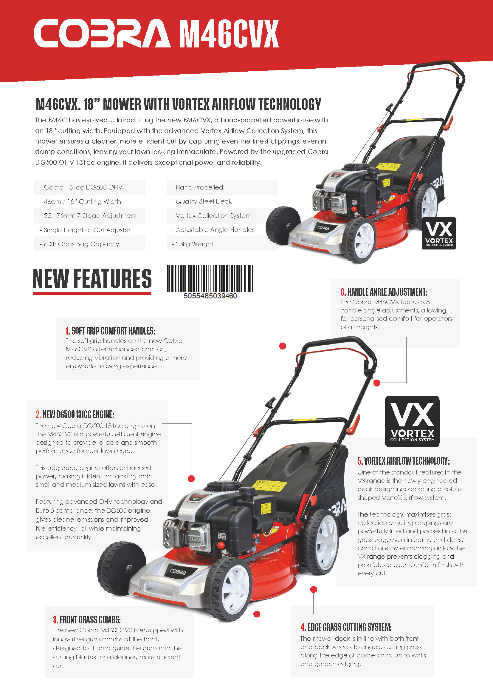 The M46C has evolved - Introducing the new M46CVX, a hand-propelled powerhouse with an 18" cutting width. Equipped with the advanced Vortex Airflow Collection System, this mower ensures a cleaner, more efficient cut by capturing even the finest clippings, even in damp conditions, leaving your lawn looking immaculate. Powered by the upgraded Cobra DG500 OHV 131cc engine, it delivers exceptional power and reliability.