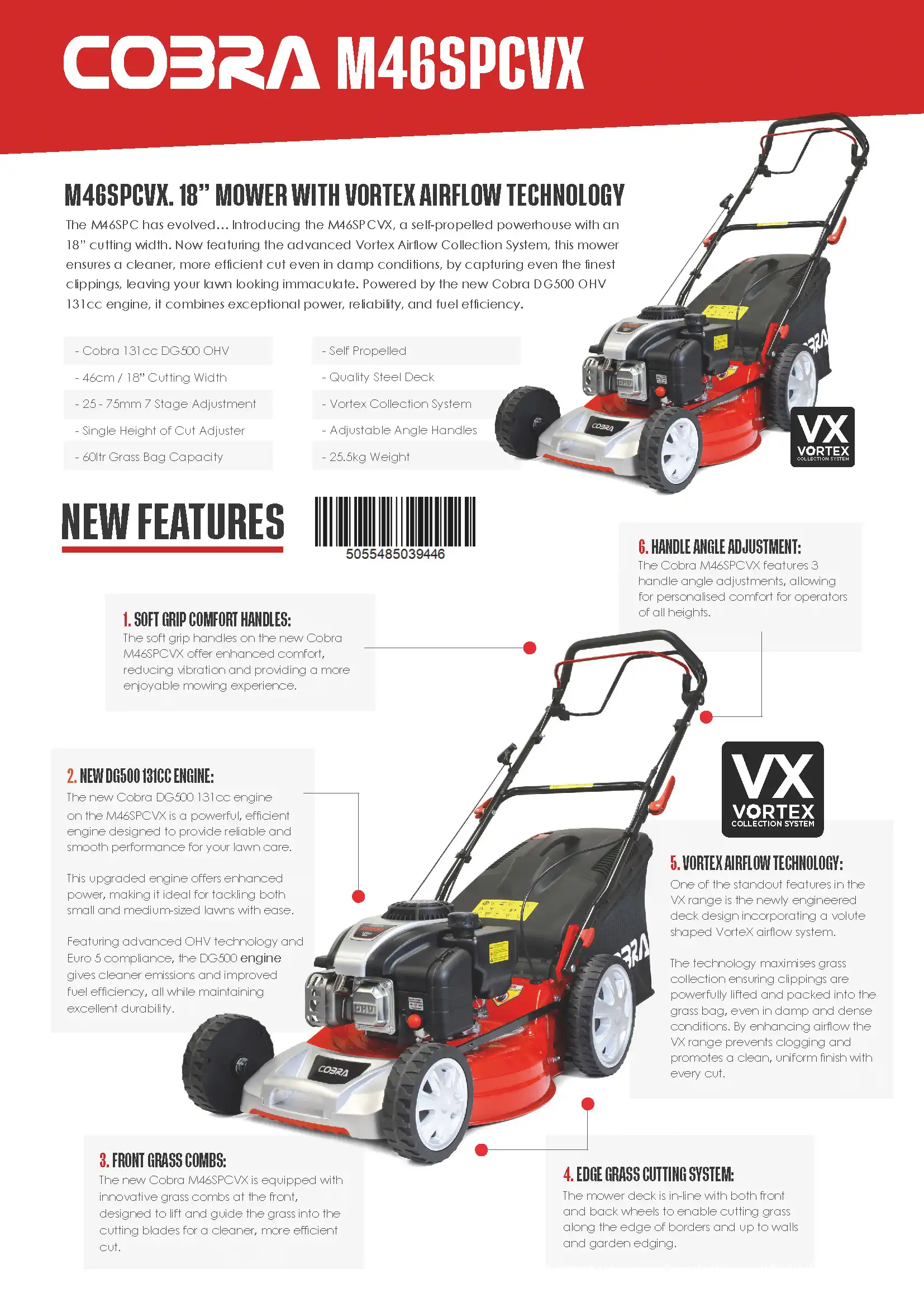 The M46SPC has evolved - Introducing the M46SPCVX, a self-propelled powerhouse with an 18" cutting width. Now featuring the advanced Vortex Airflow Collection System, this mower ensures a cleaner, more efficient cut even in damp conditions, by capturing even the finest clippings, leaving your lawn looking immaculate. Powered by the new Cobra DG500 OHV 131cc engine, it combines exceptional power, reliability, and fuel efficiency.