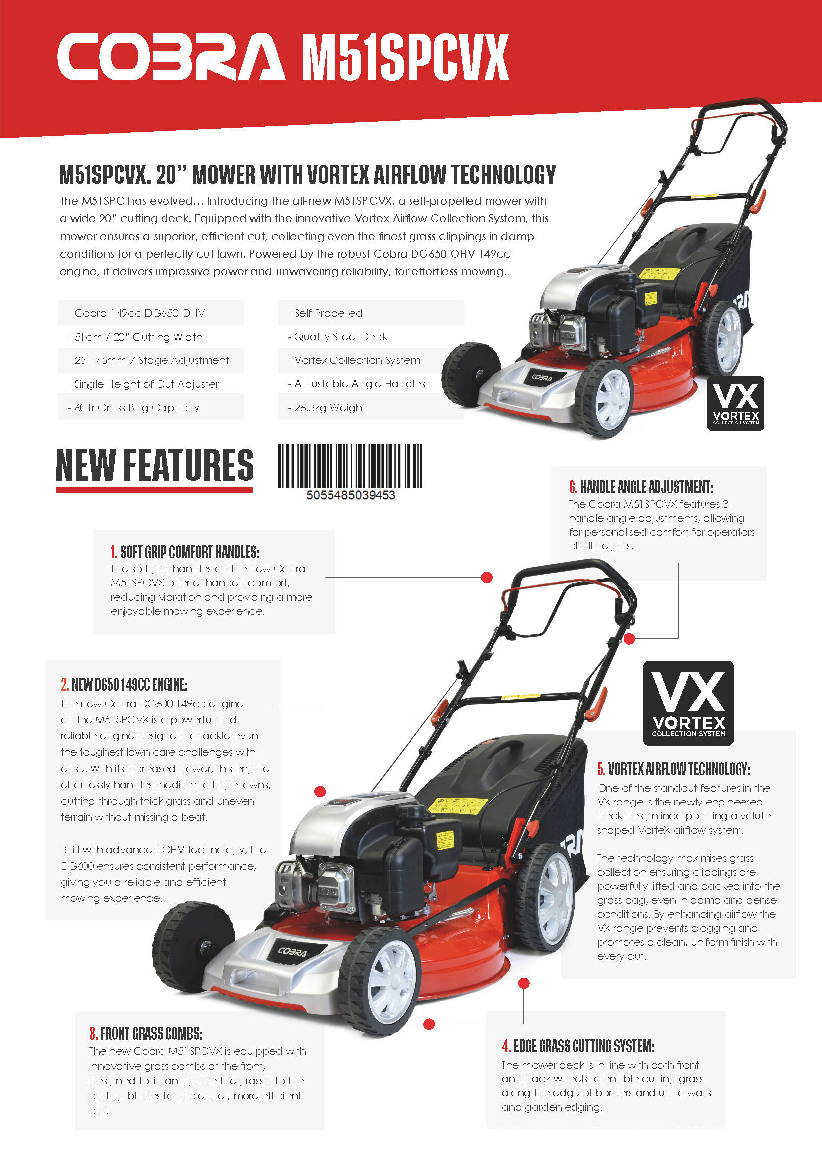 The M51SPC has evolved - Introducing the all-new M51SPCVX, a self-propelled mower with a wide 20â cutting deck. Equipped with the innovative Vortex Airflow Collection System, this mower ensures a superior, efficient cut, collecting even the finest grass clippings in damp conditions for a perfectly cut lawn. Powered by the robust Cobra DG650 OHV 149cc engine, it delivers impressive power and unwavering reliability, for effortless mowing.