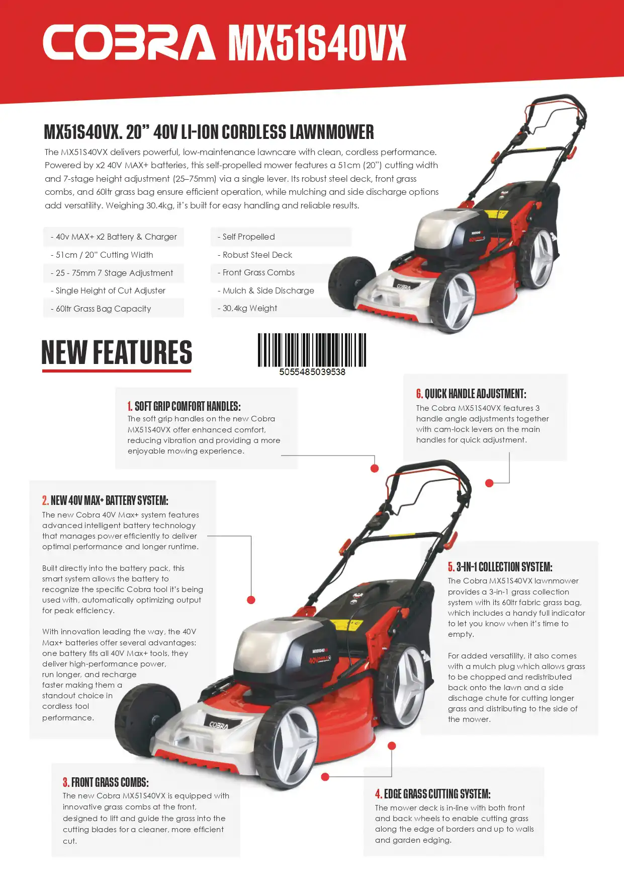 Specification Cobra MX51S40VX Premium Cordless Lawnmower KIT 40v / 41cm