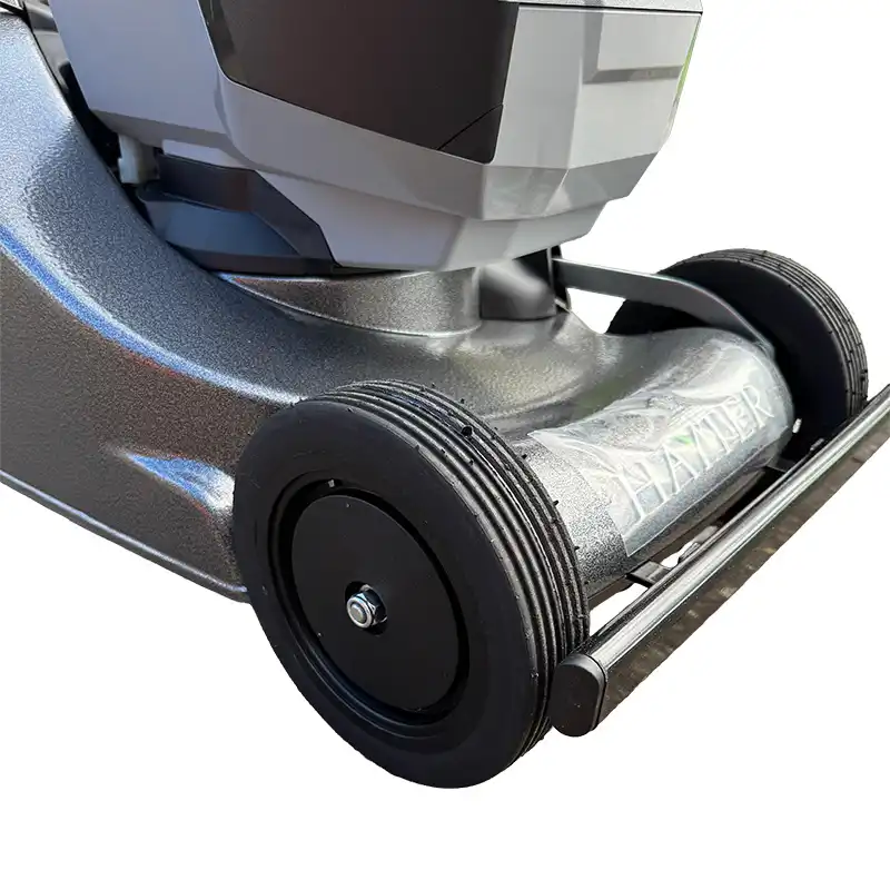 Two-piece steel ribbed rear rollers provides superior traction, manoeuvrability and avoids turf marking when turning.