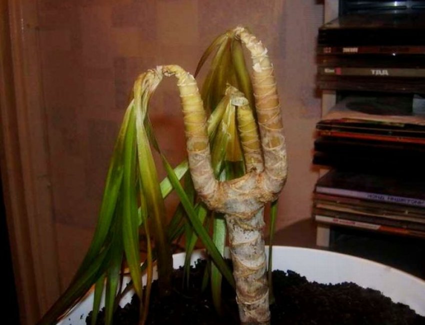 Эта драцена страдает от перелива и загнивания корней, пересадка ей может помочь