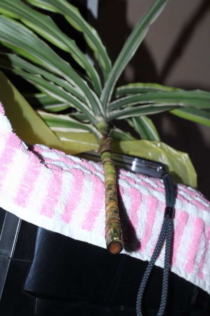 - Обмотать ствол, где удалялись листья, мхом сфагнумом и аккуратно зафиксировать его нитью. Регулярно увлажнять это место и не допускать пересыхания.