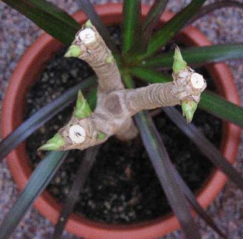 Укоренение черенков . Немного отступив от верхушки растения, сделайте на стволе Т-образный надрез. Поместите в надрез небольшое количество смоченного торфа и закрепите сверху полиэтиленовой пленкой.Молодые корни должны появиться на месте разреза примерно через 4 недели. После этого очень острым инструментом отрежьте верхнюю часть, слегка отступив от новых корней. Далее посадите верхушку в новый горшок.