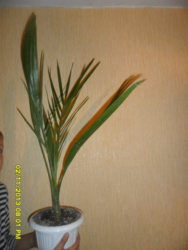 Листья бледнеют при обилии света, чтобы уберечь от яркого солнечного освещения, слегка притеняйте пальму.