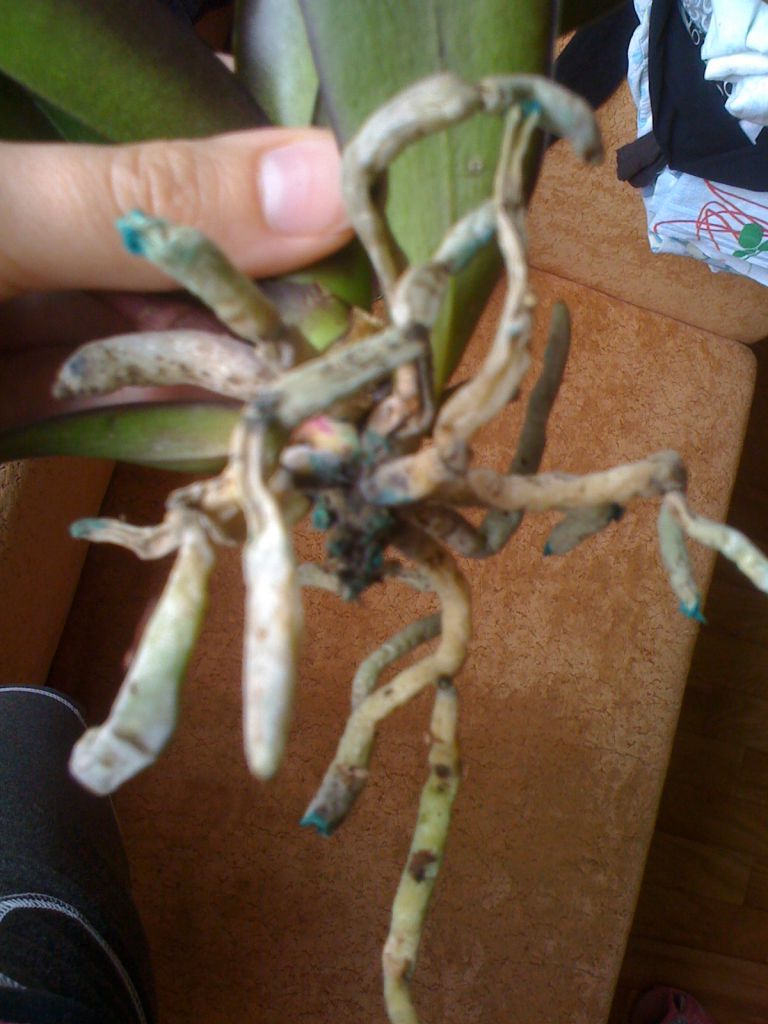 Здоровые корни имеют бледно зеленый или пепельно-серый оттенок, который после полива может стать насыщенно – зеленым.Нарушения, возникшие в корневой системе можно определить по бурому или светло-желтому их оттенку, к тому же в этом случае часто присутствует белый налет.