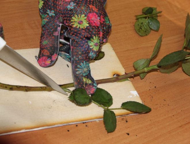 Черенки роз нарежьте острым и обеззараженным ножом или секатором длинной 15-20 см. с тремя почками. Причем нижний срез делается косым, сразу же под нижней почкой, а верхний — прямой на 1,5-2 см. выше верхней почки. Срезы обработайте слабым раствором марганцовки. Затем с черенков удалите все листья и шипы, чтобы сократить потерю влаги.