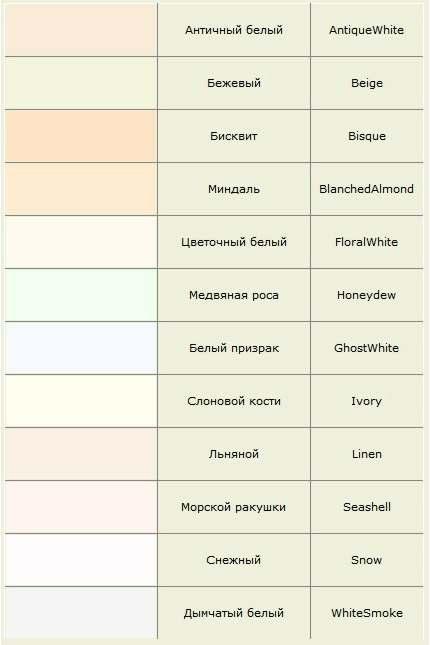 Ниже вы найдете подборку таблиц с названиями основных цветов и оттенков. Кстати, кто бы мог подумать, но у белого тоже есть множество оттенков.