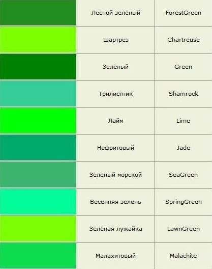 Цвет спокойствия и природы — зеленый со своими оттенками и их названиями.