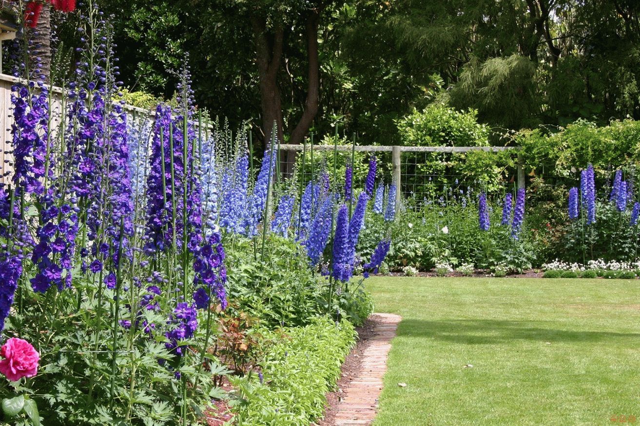 Дельфиниумы прекрасно смотрятся на передней клумбе на фоне красного, серого, желтого, зеленого, бирюзового…