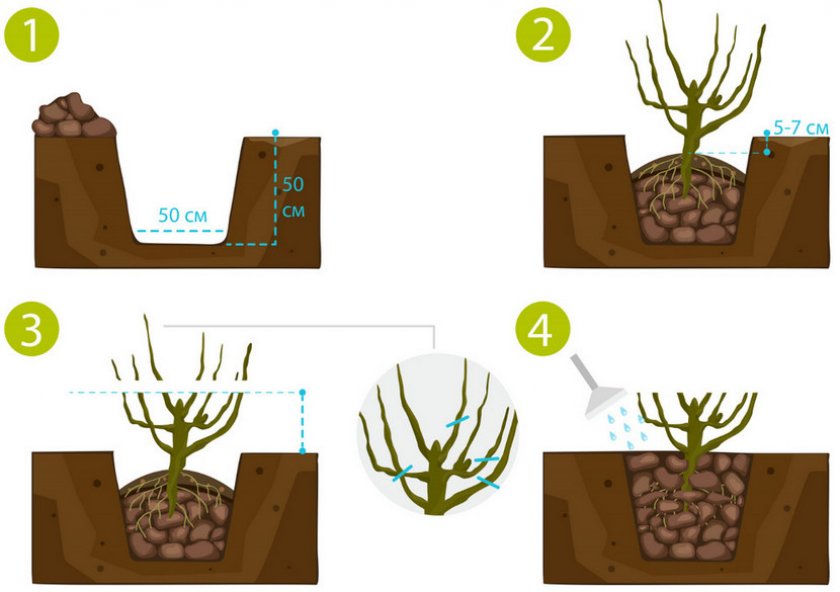 Если участок для находится в низине и не подлежит осушению, то для высадки кустов делаются специальные холмики. Высота насыпи — до 1 м, а диаметр варьируется от 2 до 2,5 м.