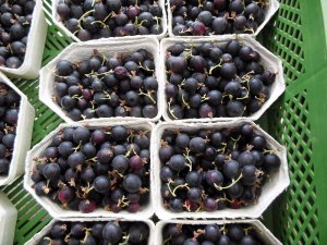 Ягоды крупные, тёмно-фиолетового, почти чёрного цвета, кисловатые на вкус, имеют аромат одновременно смородины и крыжовника. С одного куста можно получить до 5 кг ягод. Ягоды поспевают неравномерно, поэтому урожай можно собирать с июля вплоть до заморозков.