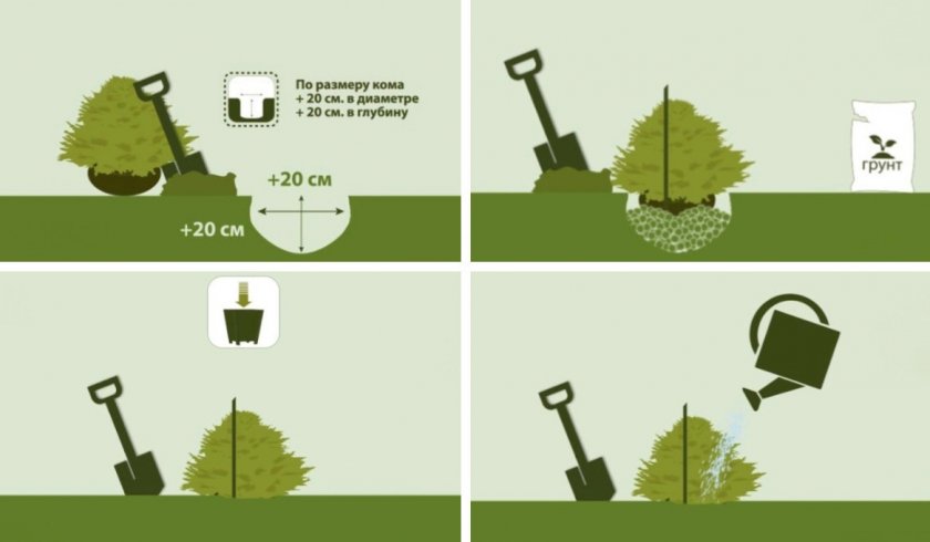 Как уже упоминалось, сажать кустик, выращенный из семян, на постоянное место можно как минимум в 3-летнем возрасте. Рекомендуется проводить процедуру в прохладный день. Культура предпочитает расти на песчаных, известковых, влажных и воздухопроницаемых грунтах. Не забудьте при пересадке сохранять земляной ком и оставлять при групповой посадке между двумя экземплярами промежуток не менее полуметра. Рассмотрим пошагово процесс пересадки.