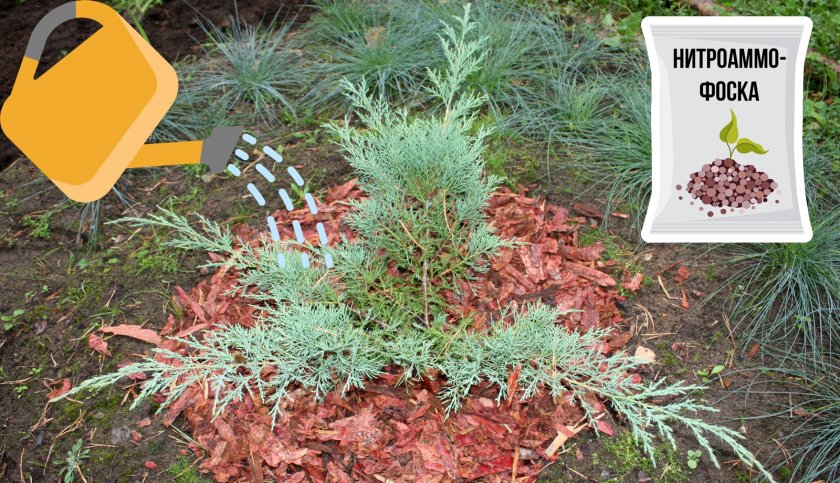 Вырастить можжевельник достаточно просто. В течение сезона полив следует производить только в продолжительную жару, при этом на 1 взрослый экземпляр берется 1–2 ведра воды. Можжевельник благоприятно реагирует на увлажнение листвы, которое рекомендуется производить 1 раз в неделю, особенно данная процедура требуется можжевельнику китайскому и обыкновенному. Периодически следует рыхлить поверхность почвы приствольного круга и при этом надо вырывать сорную траву. Подкармливать можжевельник, рекомендуется в весеннее время, для этого по поверхности приствольного круга надо распределить от 30 до 40 грамм нитроаммофоски. Удобрение заделывают в почву, а затем обязательно поливают. В том случае, если растение посажено в очень бедный грунт, то удобрять данным способом его следует на протяжении всего вегетационного сезона, но при этом перерыв в подкормках должен быть не менее 4 недель.