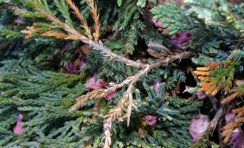 Если почки хвойника при солнечном ожоге остаются живы, то молодые побеги постепенно прикрывают обожженные места, но, если почки погибли, то пострадавшие от морозов ветви необходимо срезать до здоровой древесины и обработать садовым варом.