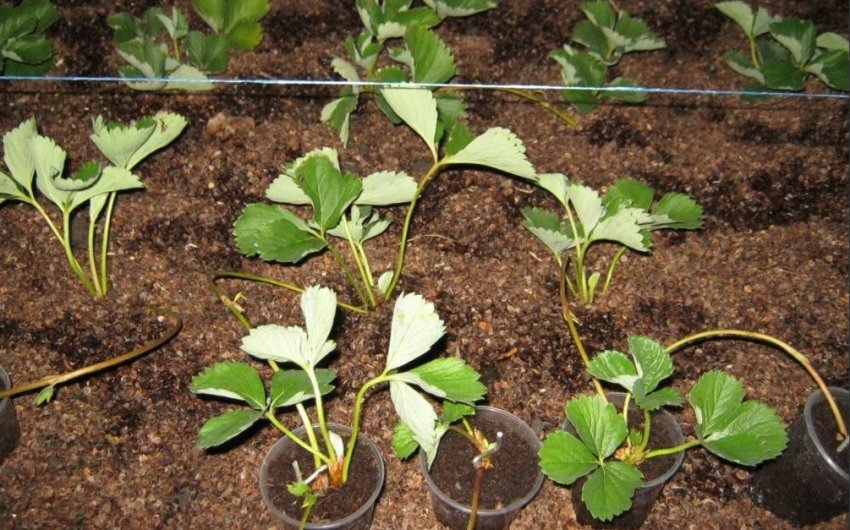 Для укоренения и развития корни выбранных розеток прикапываются землей. Если на усах еще нет корешков, их пришпиливают к почве, предварительно взрыхлив ее. А если растет садовая земляника на черном геотекстиле, усы для укоренения сажают в емкости (одноразовые стаканчики, кружки или другую подходящую тару).
