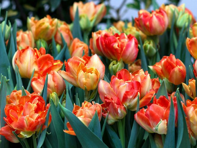 - Тюльпаны. Есть сорта, которые цветут с мая по июль. Высота стеблей достигает 150 см. Форма садового цветка может быть: звездчатой, чашевидной, махровой и бокальной. Цвет бутонов может быть от белого до черного.