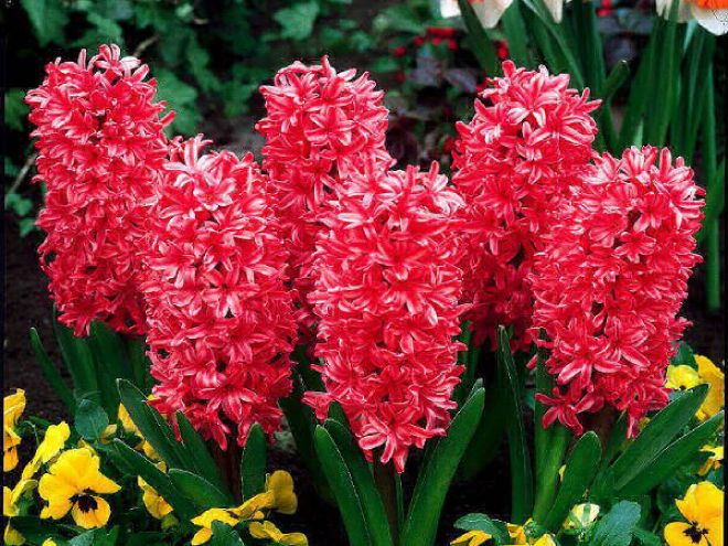 - Гиацинт. Гиацинты являются символом весны. Именно с него начинается цветение всех растений в саду. Гиацинты садят по краям клумбы, он обладает чудесным ароматом, а его внешний вид просто покоряет;