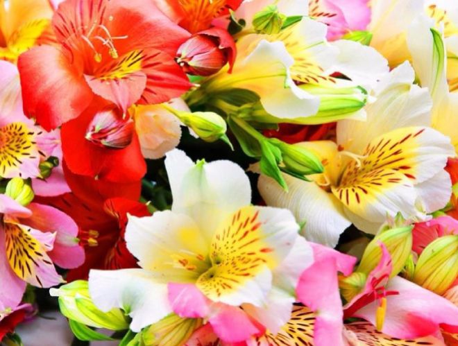 - Альстромерия. Садовые цветки напоминают лилии и орхидеи. Высота цветоноса доходит до 100 см. Окрас цветка бывает такой: белый, кремовый, золотистый, оранжевый, лиловый, пурпурный с вкраплениями. Большой популярностью пользуются следующие сорта: Алисия, Бьюти, Канария и Орэндж Квин.