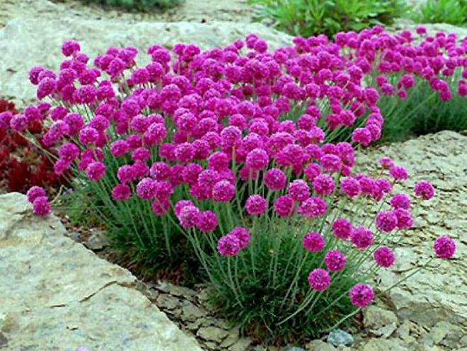- Армерия. Плотные и шаровидные кусты возвышаются над землей на высоте до 50 см. Бутоны окрашены в такие оттенки: розовый, белый или пурпурный. Цветение продолжается с конца весны и до конца лета.