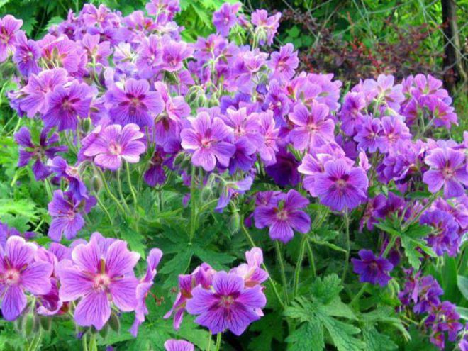 - Балканская герань. Садовые почвопокровные цветы, высота которого не превышает 25 см. В цветение вступает в начале лета. Цветки окрашены в пурпурный и темно-красный оттенок.