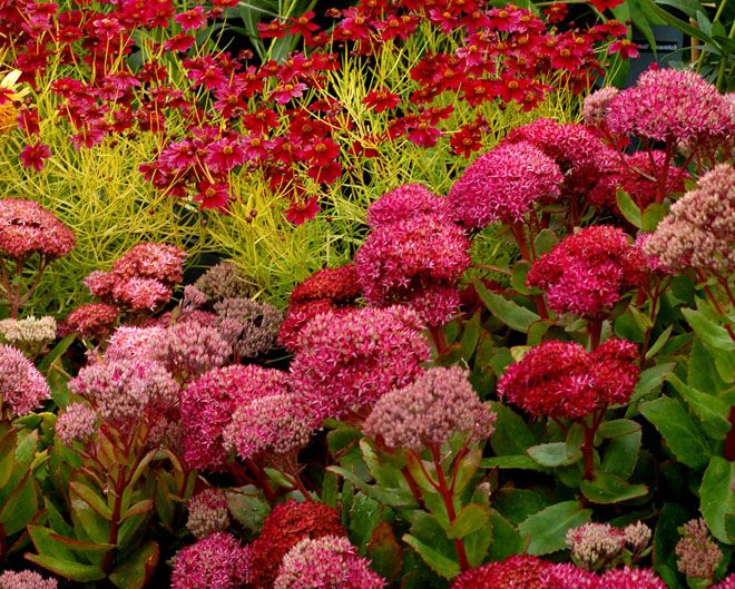 - Седум (очиток). Известно около 500 видов. Высота не более 80 см. Вырастают в диаметре до 30 см. Распускаются к концу лета. Могут быть окрашены в белый, бледно-лиловый, ярко-розовый, бордовый и бордово-коричневый цвета.