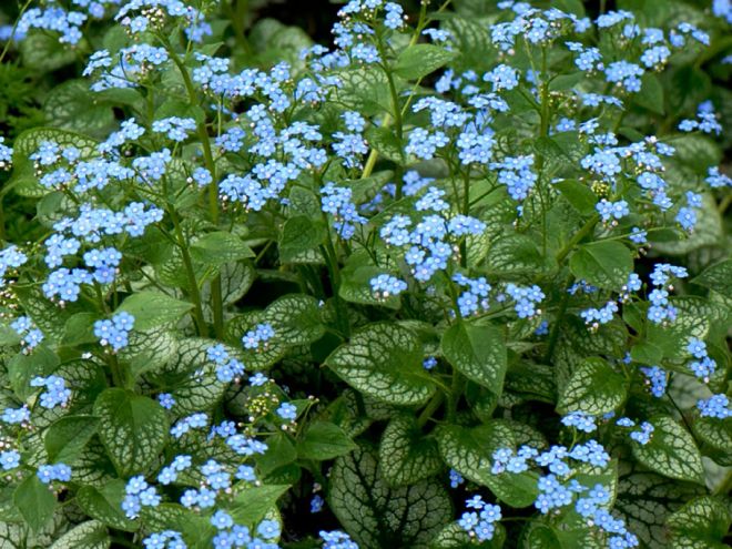 - Бруннера. Садовый цветок представляет собой сердце, состоящее из гигантских листьев, окрашенных в пестрый цвет. Объединяет в себе три разных культуры. Садовый цветок может вырасти до 50 см.