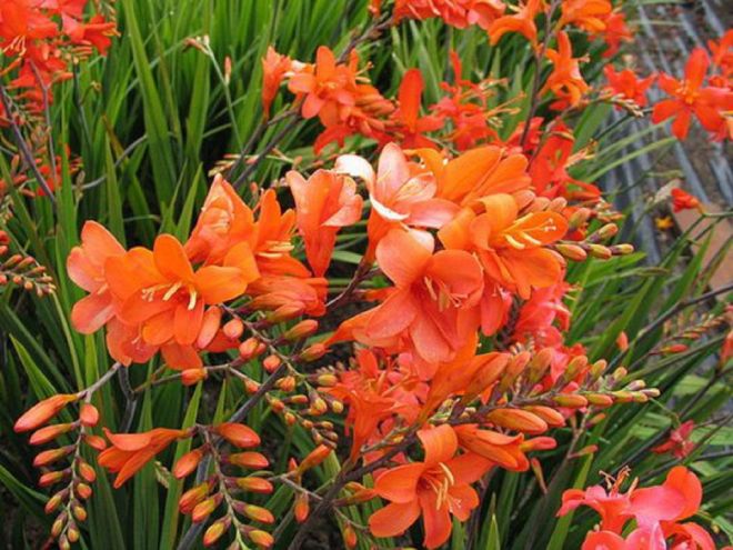 - Крокосмия (монтбреция). Длина стеблей достигает 100 см. Время цветения – вторая часть лета. Клубневые цветы представлены трубчатыми или звездчатыми цветками. Среди самых популярных можно выделить: Золотистую, Массонорум, Потса, Люцифер и другие.