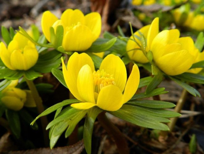 - Эрантис (весенник). Бутоны распускаются в марте. Садовые цветки окрашены в желтый оттенок. Высота стеблей достигает 30 см. Известны следующие виды: Зимующий, Длинноножковый, Киликийский, Звездчатый и другие.
