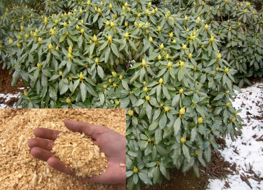 Древесные опилки используют для утепления и мульчирования грунта, в котором растёт рододендрон. Для этого ими обильно посыпают приствольный круг. Такой способ поможет корням получать достаточное количество влаги. Также земля сохранит необходимое тепло и убережёт корневую систему от обморожения.
