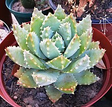 Листья у него ланцетные, достигающие в длину до 10 см, а в ширину1,5 см. Их цвет может изменяться от серо-зеленого до серо-голубого. Сверху листья покрыты небольшими шипами. Цветет суккулент летом и часто даже в домашних условиях.