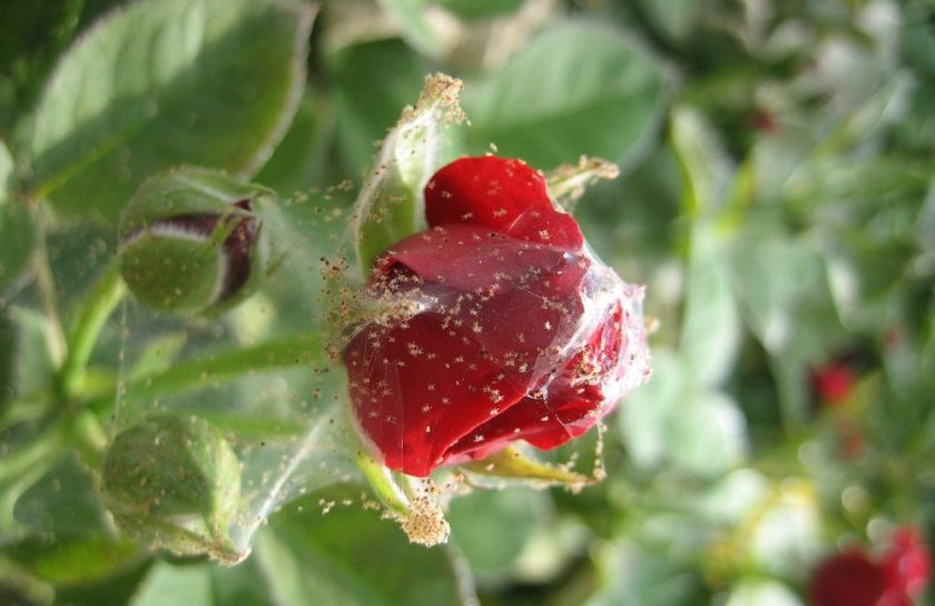 Паразиты тоже могут повредить розы. Один из них — паутинный клещ, для борьбы с которым необходима регулярная обработка. Нередко листья начинают вянуть и выцветать, если в корневой системе завелись личинки. Поскольку они быстро размножаются и могут погубить растение, приходится использовать инсектицид. Через месяц проводят повторную обработку.