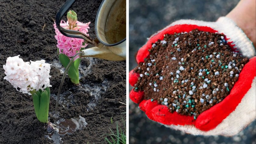 Азотсодержащие удобрения гиацинту не нужны, поскольку они инициируют рост зелёной массы, но угнетают появление и развитие цветоносного побега. Противопоказана этой культуре и свежая органика, поскольку она инициируют гнилостные процессы в клубнелуковице и появление грибковых болезней.