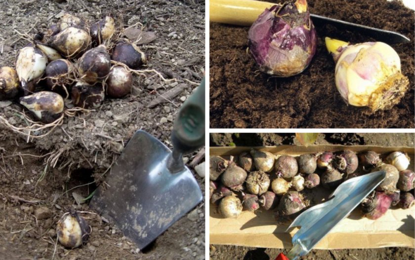 Оптимальным периодом являются последние недели июня – первая половина июля, когда листья растения становятся жёлтыми и слабыми. Наземная часть цветка удаляется, клубни извлекаются из почвы, моются водой и хорошенько обсушиваются. Далее проводим ревизию — повреждённые (или с явными признаками болезни) экземпляры выбрасываем. Если на луковице имеются неразвитые детки, их отделяют и откладывают на доращивание. Перед хранением все клубни подлежат обработке от заболеваний и вредителей.