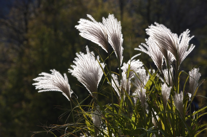 Высокая трава, необычайно декоративная, напоминающая тростник. В сентябре выпускает пушистые, мягкие на ощупь метелки. Нравится теплое и солнечное место, плодородная, влажная почва. Сорт «Zebrinus» имеет яркие полоски, а «Silberfeder» выпускает длинные стебли с белой полосой посередине.