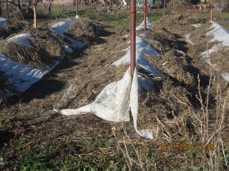 Я обычно сеном прикрываю. Во-первых, потому, что поздно сажаю, иногда даже в ноябре, а во вторых — забываю, куда посадила. Весной по сену можно определить место посадки.