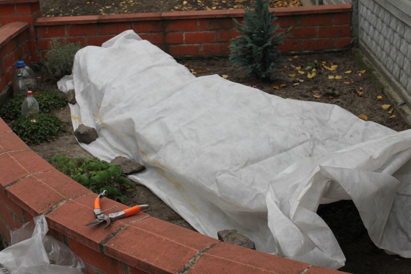 По краям картона я кладу камни, которые не дают укрытию отогнуться зимой – у нас довольно сильные ветры и без такой предосторожности картон может просто слететь, несмотря на слой навоза.