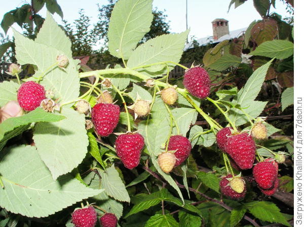 Плодоношение ремонтантной малины Геракл. Одновременно и красные ягоды и завязи, и цветы