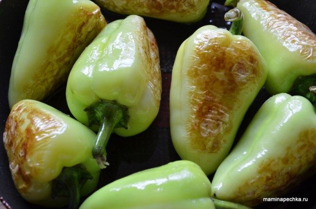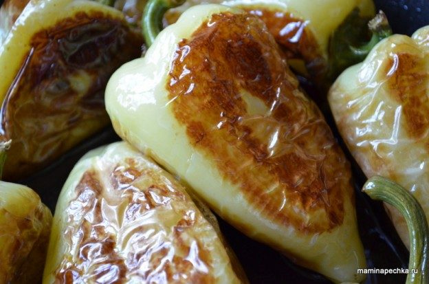 Ваша задача подрумянить перец со всех сторон. Чем большая площадь перца будет обжарена, тем легче с него снимется тонкая плёнка.