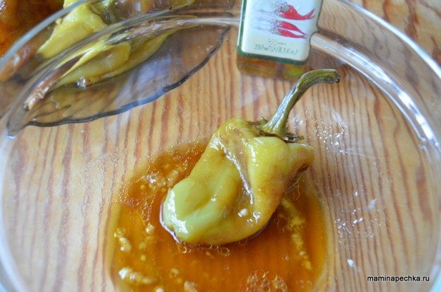 Уложите в миску с соусом все очищенные перцы — их также посолите.