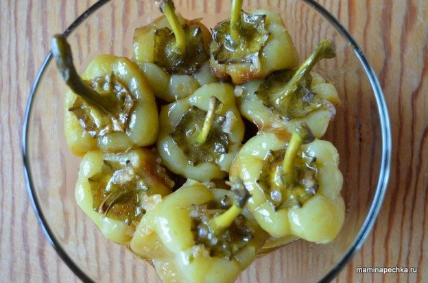 Выкладываем перцы на блюдо, смазывая полученным соусом. Оставляем немного помариноваться. Можно охладить в холодильнике.