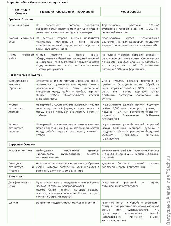 Многолетний дельфиниум способен прожить на одном месте 8-10 лет, после чего нуждается в пересадке. Эти прекрасные цветы, к сожалению, подвержены заболеваниям. Как распознать их по признакам и меры борьбы смотрите в таблице: