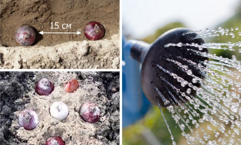 Завершается посадка тем, что луковицы устанавливают на песок и сверху прикрываются песком (чтоб не загнивали), потом плодородной почвой. Место посадки обильно поливается водой. В том случае когда растение высаживают во влажный грунт сразу же после дождя, то полив делать не нужно.