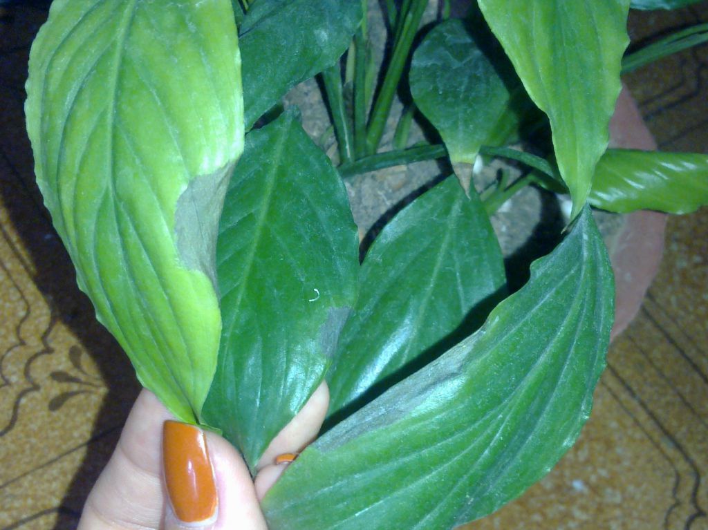 В результате ожога корневой системы удобрениями обширные темные пятна появляются на листьях спатифиллума очень быстро. Затем листья приобретают желтую окраску и отмирают.