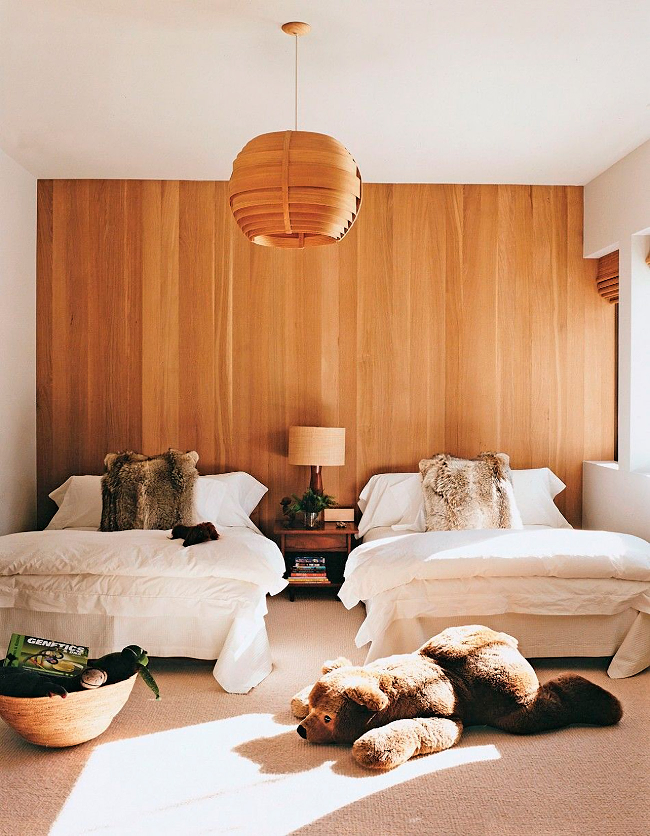 Интерьер с планками натурального оттенка в спальне с белой мебелью выглядит свежо и останется актуальным на долгие годы.