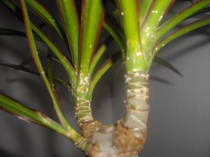 Любит ложную пальму и щитовка, которая покрывает листья коричневыми пятнами. Можно попробовать спасти драцену промыванием мыльным составом с добавлением водки. При сильном заражении лучше прибегнуть к специальному средству — Актеллику. Оранжерейная тля и мучнистый червец также удаляются мыльным раствором и обработкой защитными аэрозолями. Дополнительно нужно обработать подоконник и близлежащую зону.