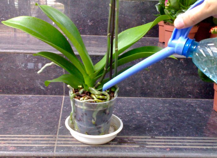 - Орхидеи нужно поливать по верху субстрата. Вода должна свободно пройти сквозь почву, как через сито. При этом грунт обогащается кислородом.